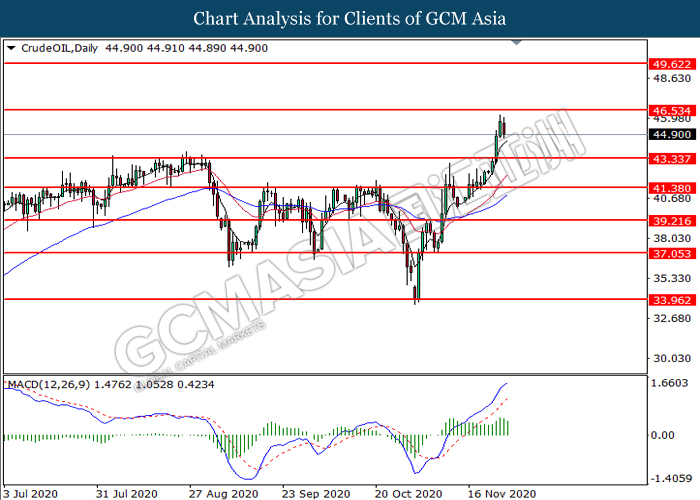 CrudeOIL, Daily: Crude oil price was traded lower following prior retracement from the resistance level at 46.55. MACD which illustrate diminishing bullish momentum signal suggest the commodity to extend its losses toward the support level at 43.35.
