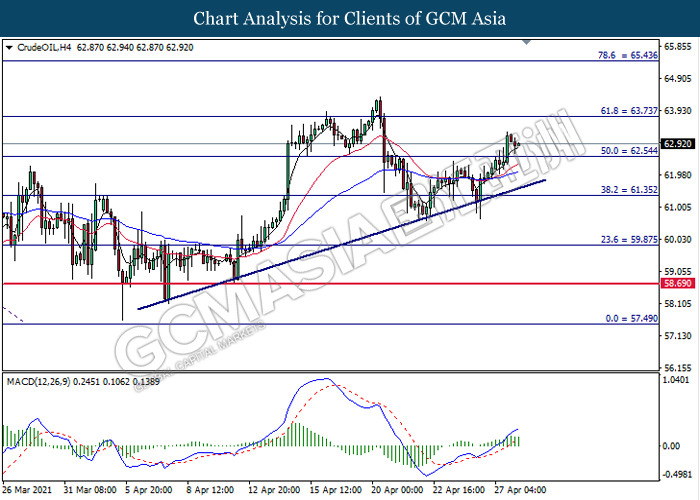 CrudeOIL, H4: Crude oil price was traded higher following prior breakout above the previous resistance level at 62.55. MACD which illustrated bullish bias momentum suggest the commodity to extend its gains toward the resistance level at 63.75.