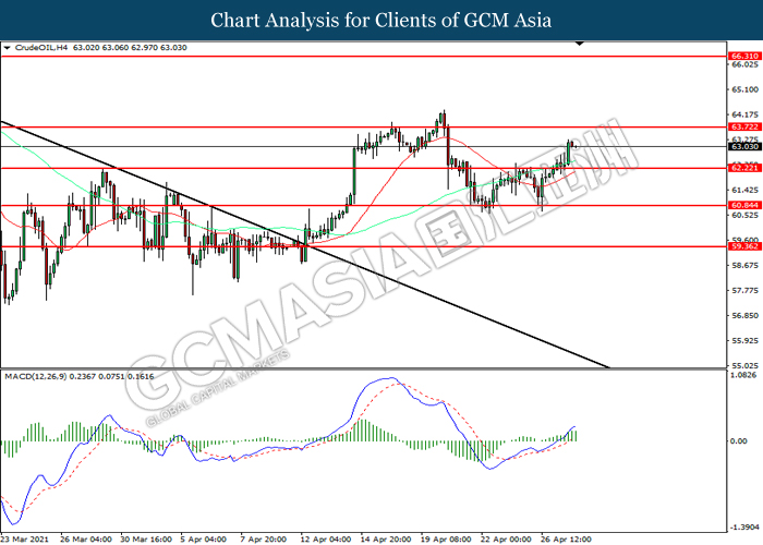 CrudeOIL, H4: Crude oil price was traded higher following prior breakout above the previous resistance level at 62.20. MACD which illustrated increasing bullish momentum suggest the commodity to extend its gains toward resistance level at 63.70.