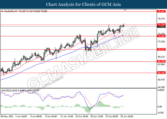 CrudeOIL, H4: Crude oil price was traded higher while currently testing the resistance level 74.20. However, MACD which illustrate diminishing bullish momentum signal suggest the commodity to be traded lower as a technical correction towards the support level 72.40.