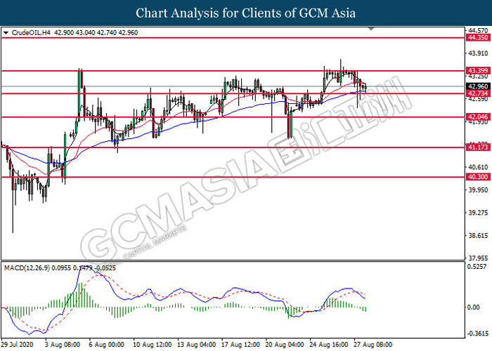 CrudeOIL, H4: Crude oil price was traded lower while currently testing the support level at 42.75. MACD which illustrate bearish bias momentum suggest the commodity to extend its losses after it successfully breakout below the support level.