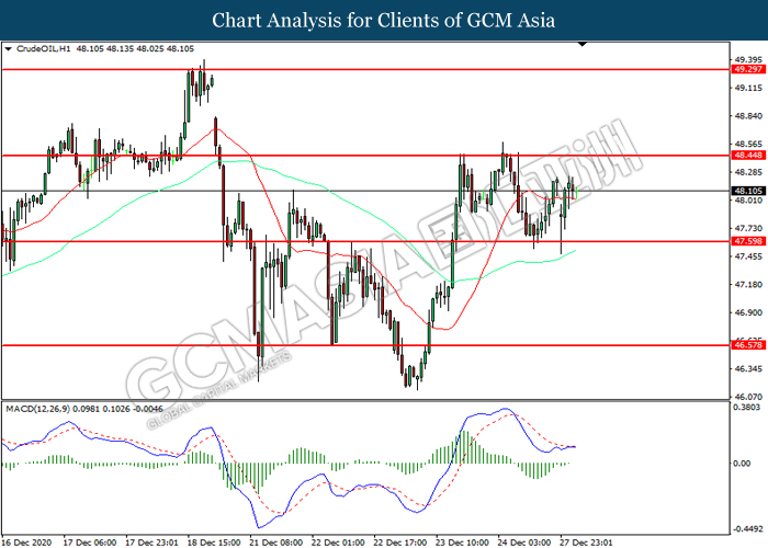 CrudeOIL, H1: Crude oil price was traded higher following prior rebound from the support level at 47.60. MACD which illustrated diminishing bearish momentum suggest the commodity to extend its gains toward resistance level at 48.45.