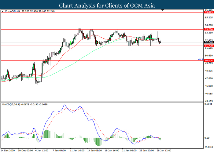 CrudeOIL, H4: Crude oil price was traded within a range while currently near the support level at 51.75. MACD which illustrated increasing bearish momentum suggest the commodity to be traded lower after it successfully breakout below the support level.