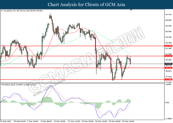 CrudeOIL, H4: Crude oil price was traded lower following prior retracement from the resistance level at 61.15. MACD which illustrated diminishing bullish momentum suggest the crude oil to extend its losses toward support level at 59.30.