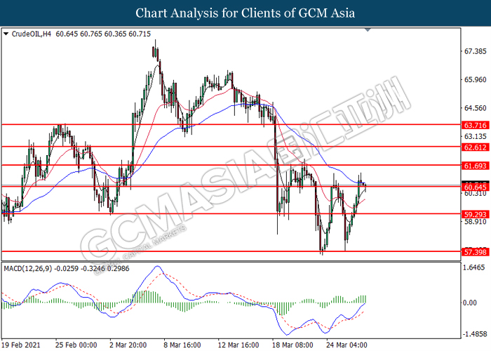 CrudeOIL, H4: Crude oil price was traded lower while currently testing the support level at 60.65. However, MACD which illustrated bullish bias momentum suggest the commodity to undergo technical correction in short term.