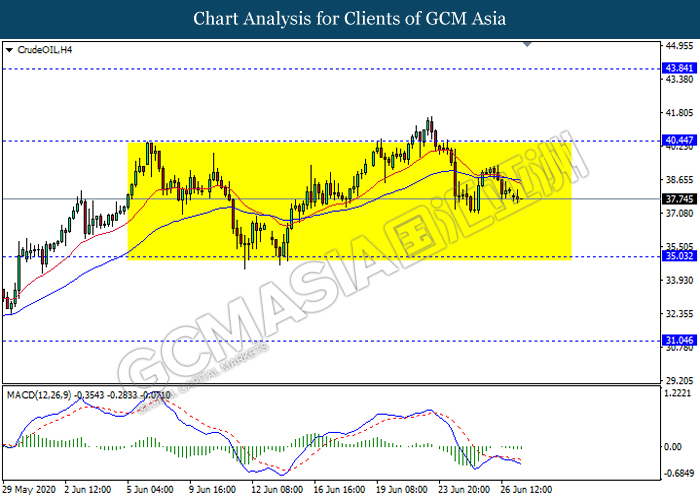 CrudeOIL, H4: Crude oil price remain traded in a sideway channel following recent retracement from its high level. However, MACD which illustrate bearish bias signal suggest the commodity to extend its downward momentum in short term towards the support level 35.05.