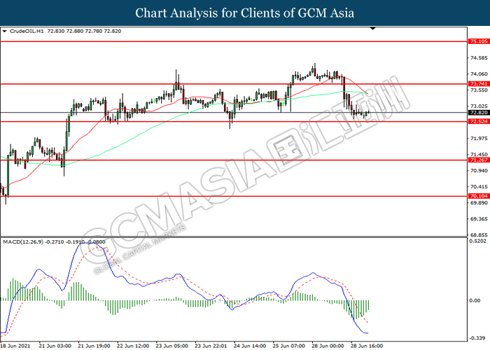 CrudeOIL, H1: Crude oil price was traded lower while currently testing the support level at 72.50. However, MACD which illustrated diminishing bullish momentum suggest the commodity to be traded higher in short-term as technical correction.