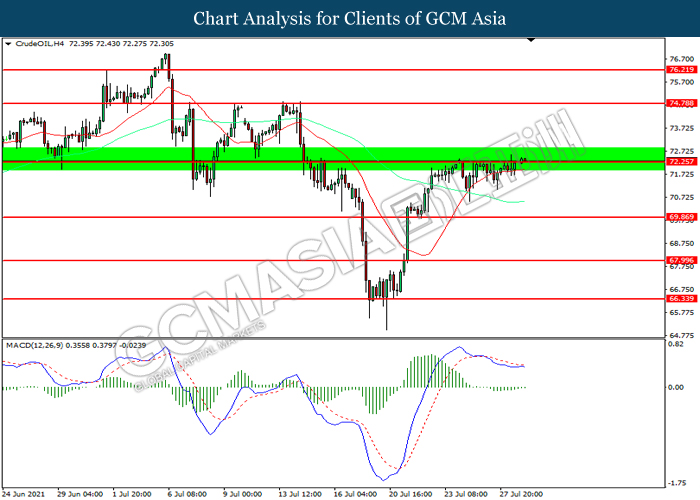 CrudeOIL, H4: Crude oil price was traded higher while currently testing the resistance level at 72.25. MACD which illustrated diminishing bearish momentum suggest the commodity to extend its gains after it successfully breakout above the resistance level.