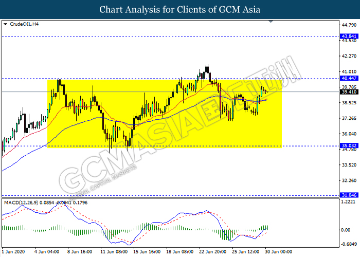 CrudeOIL, H4: Crude oil price remain traded in a sideway channel while currently testing near the resistance level 40.45. However, MACD which illustrate bullish momentum signal suggest the commodity to be traded higher after it breaks above the resistance level.