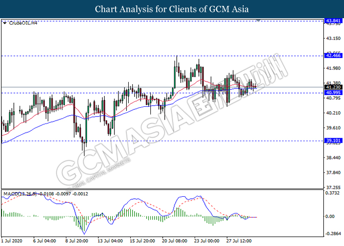 CrudeOIL, H4: Crude oil price was traded flat while currently testing near the support level 41.00. Due to lack of clear direction and momentum from MACD, it is suggested to wait until further signal appear before entering the market.
