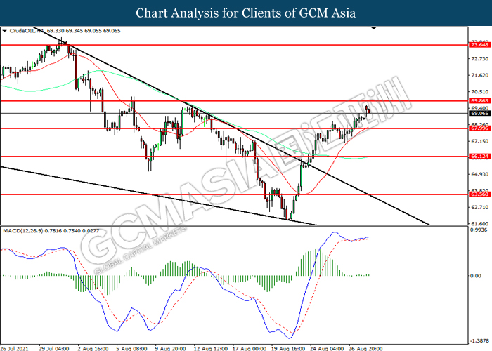 CrudeOIL, H4: Crude oil price was traded higher while currently testing the resistance level at 69.85. However, MACD which illustrated bearish momentum suggest the commodity to be traded lower in short-term as technical correction.
