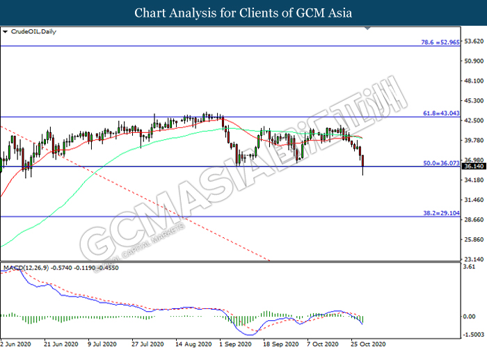 CrudeOIL, Daily: Crude oil price was traded lower while currently testing the support level at 36.05. MACD which illustrated increasing bearish momentum suggest the commodity to extend its losses after it successfully breakout below the support level.