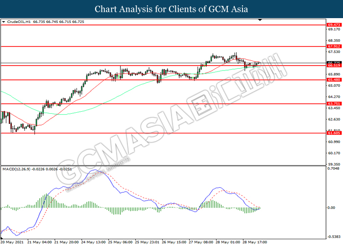 CrudeOIL, H1: Crude oil price was traded lower while currently testing the support level at 66.50. However, MACD which illustrated diminishing bearish momentum suggest the commodity to be traded higher in short-term as technical correction.