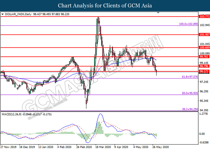 DOLLAR_INDX, Daily: Dollar index was traded lower while currently testing the support level at 98.25. MACD which illustrate bearish bias momentum suggest the pair to extend its losses after it successfully breakout below the support level at 98.25.
