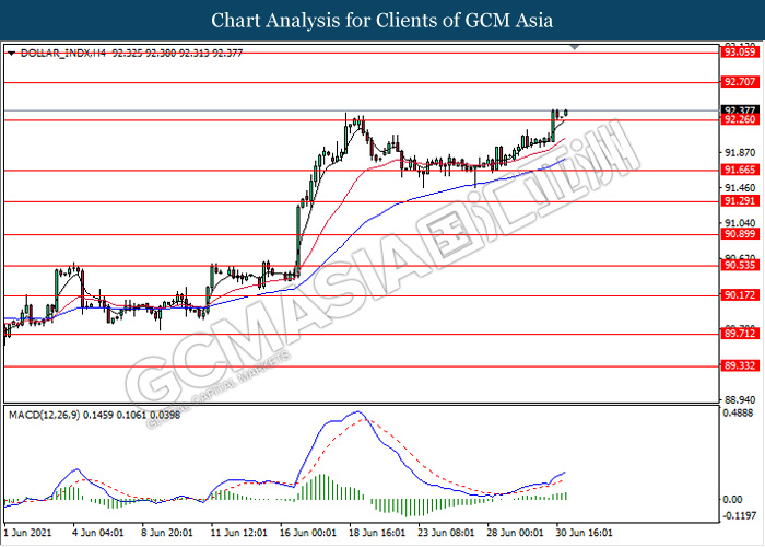 DOLLAR_INDX, H4: Dollar index was traded higher following prior breakout above the previous resistance level 92.25. MACD which illustrate ongoing bullish momentum signal suggest the dollar to extend its gains towards the resistance level 92.70.