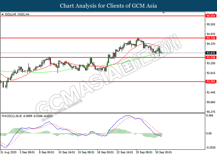 DOLLAR_INDX, H4: Dollar index was traded lower while currently near the support level at 93.55. MACD which illustrated increasing bearish momentum suggest the index to extend its losses after it successfully breakout below the support level.