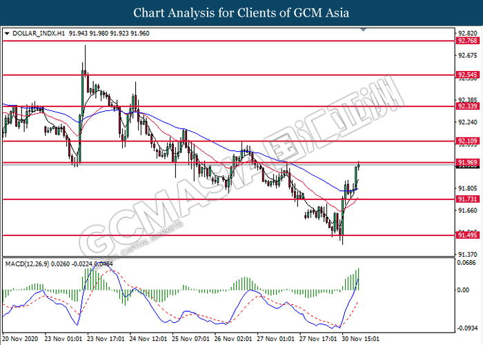 DOLLAR_INDX, H1: Dollar index was traded higher while currently testing the resistance level at 91.95. MACD which illustrate bullish bias momentum signal suggest the dollar to extend its gains after it successfully breakout above the resistance level.