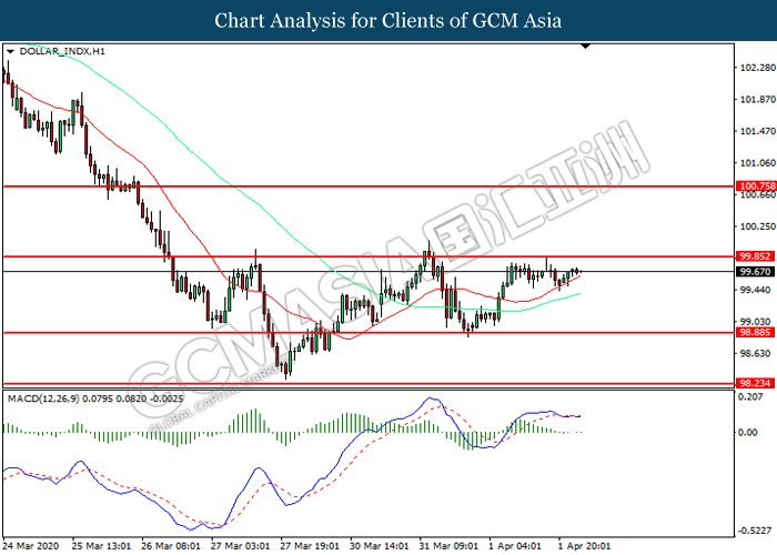 DOLLAR_INDX, H1: Dollar index was traded higher while currently near the resistance level at 99.85. However, MACD which illustrated increasing bearish momentum suggest the index to be traded lower in short-term as technical correction.