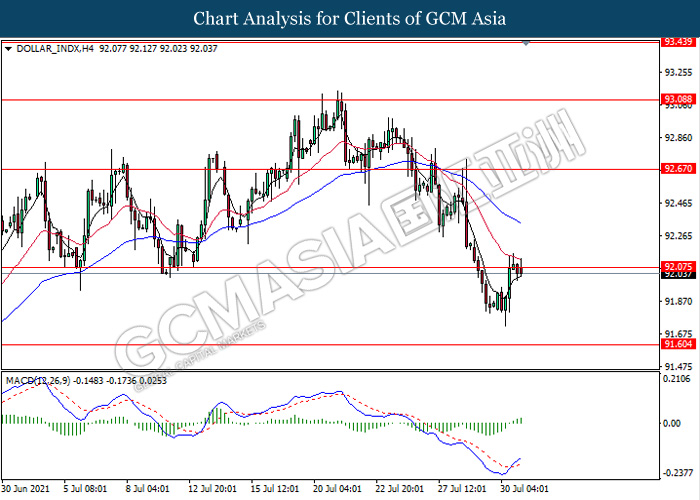 DOLLAR_INDX, H4: Dollar index was traded higher while currently testing the resistance level 92.05. MACD which illustrate bullish momentum signal with the formation of golden cross suggest the dollar to extend its gains after it breaks above the resistance level.