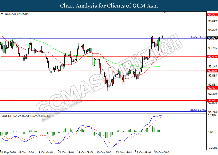 DOLLAR_INDX, H4: Dollar index was traded higher while currently testing the resistance level at 94.00. However, MACD which illustrated diminishing bullish momentum suggest the index to be traded lower in short-term as technical correction.