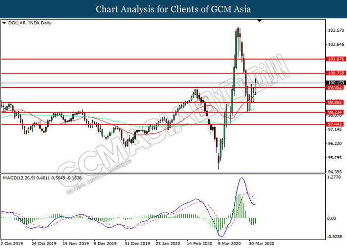 DOLLAR_INDX, Daily: Dollar index was traded higher following prior breakout above the previous resistance level at 99.85. MACD which illustrated diminishing bearish momentum suggest the index to extend its gains toward resistance level at 100.75.