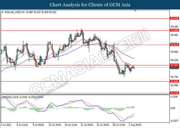DOLLAR_INDX, H4: Dollar index was traded flat while currently testing near the resistance level 92.05. MACD which illustrate ongoing bullish momentum signal suggest the dollar to be traded higher after it breaks above the resistance level.