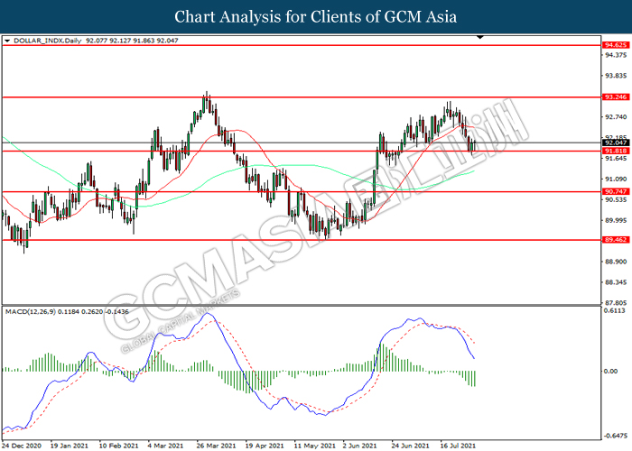 DOLLAR_INDX, Daily: Dollar index was traded lower while currently testing the support level at 91.80. MACD which illustrated increasing bearish momentum suggest the index to extend its losses after it successfully breakout below the support level.