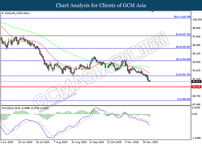 DOLLAR_INDX, Daily: Dollar index was traded lower following prior breakout below the previous support level at 91.75. MACD which illustrated increasing bearish momentum suggest the index to extend its losses toward support level at 90.10.