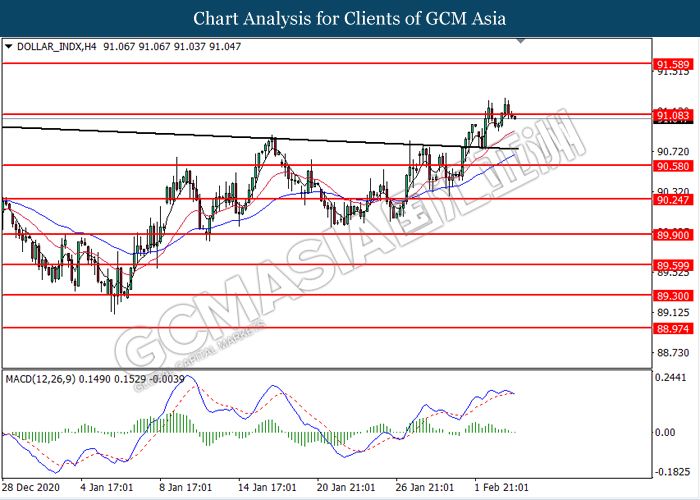 DOLLAR_INDX, H4: Dollar index was traded lower following prior retracement near the resistance level at 91.10. MACD which illustrated diminishing bullish momentum suggest the index to extend its losses toward the support level at 90.60.