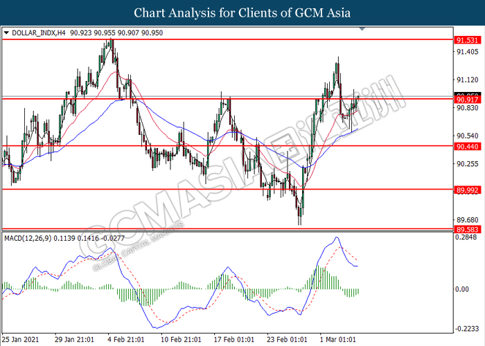 DOLLAR_INDX, H4: Dollar index was traded higher while currently testing the resistance level at 90.90. MACD which illustrated diminishing bearish momentum suggest the index to extend its gains after it successfully breakout above the resistance level.