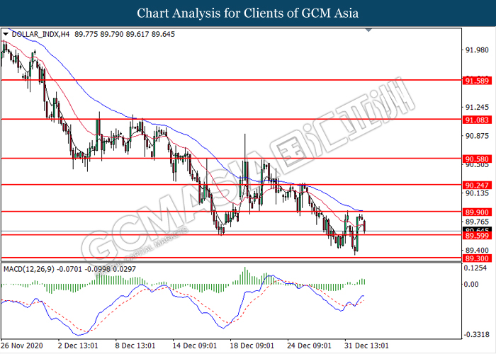 DOLLAR_INDX, H4: Dollar index was traded lower following prior retracement from the resistance level at 89.90. MACD which illustrated diminishing bullish momentum suggest the index to extend its losses toward the support level at 89.60.