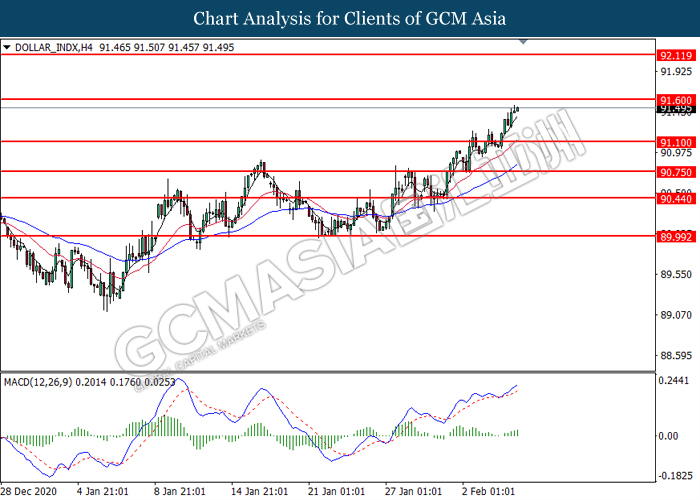 DOLLAR_INDX, H4: Dollar index was traded higher following prior breakout above the previous resistance level at 91.10. MACD which illustrated bullish bias momentum suggest the index to extend its gains toward the resistance level at 91.60.