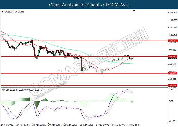 DOLLAR_INDX, H1: Dollar index was traded within a range while currently testing the resistance level at 99.55. MACD which illustrated increasing bearish momentum suggest the index to be traded higher after it successfully breakout above the resistance level.