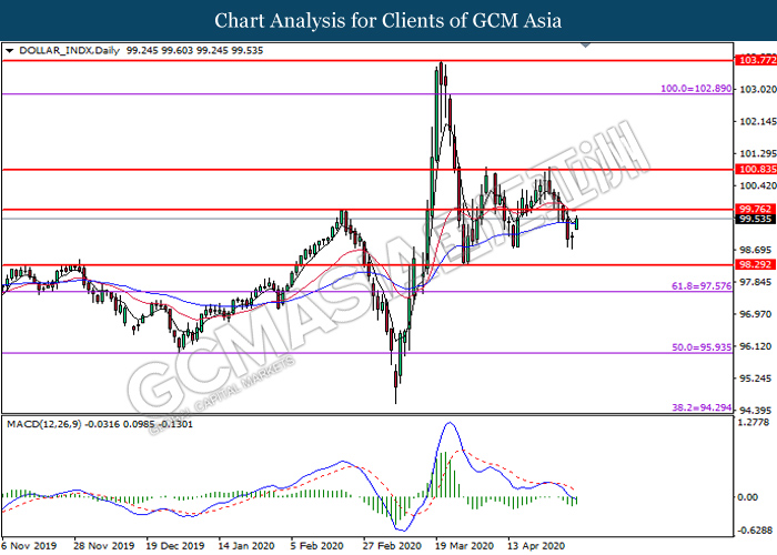 DOLLAR_INDX, Daily: Dollar index was traded higher following prior rebound from the lower level. MACD which illustrate diminishing bearish momentum suggest the pair to extend its gains toward the resistance level at 99.75.