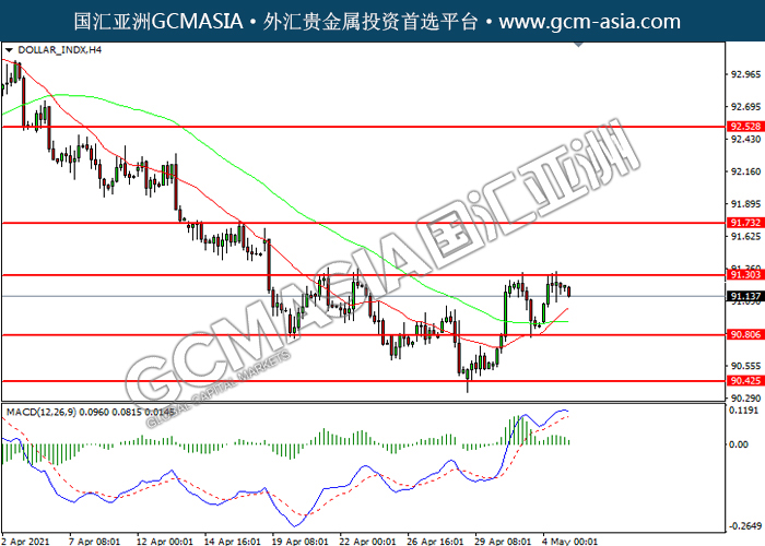 DOLLAR_INDX, H4: Dollar index was traded lower following prior retracement from the resistance level at 91.30. MACD which illustrated diminishing bullish momentum suggest the index to extend its losses toward support level at 90.80.