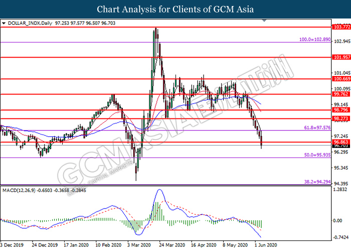 DOLLAR_INDX, Daily: Dollar index was traded lower while currently testing the support level at 96.85. MACD which illustrate bearish bias momentum suggest the pair to extend its losses after it successfully breakout below the support level at 96.85.