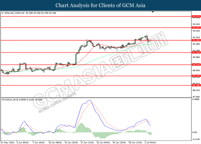 DOLLAR_INDX, H4: Dollar index was traded lower while currently testing the support level at 92.30. MACD which illustrated increasing bearish momentum suggest the index to extend its losses after it successfully breakout below the support level.