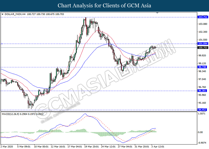 DOLLAR_INDX, H4: Dollar index was traded higher while currently testing near the resistance level 101.10. However, MACD which illustrate diminishing bullish momentum suggest the dollar to experience a technical correction in short term towards the support level 98.75.