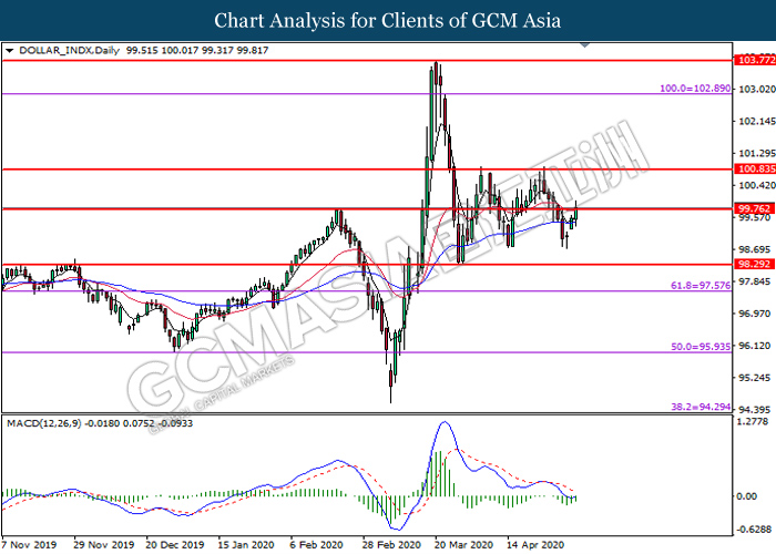 DOLLAR_INDX, Daily: Dollar index was traded higher while currently testing the resistance level at 99.75. MACD which illustrate diminishing bearish momentum suggest the pair to extend its gains after it successfully breakout above the resistance level.