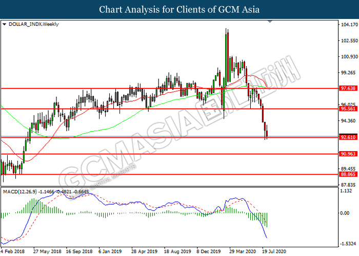DOLLAR_INDX, Weekly: Dollar index was traded lower while currently testing the support level at 92.60. MACD which illustrated increasing bearish momentum suggest the index to extend its losses after it successfully breakout below the support level.