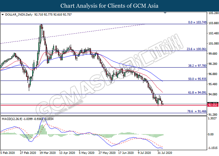 DOLLAR_INDX, Daily: Dollar index was traded lower while currently testing the support level at 92.55. However, MACD which illustrate diminishing bearish momentum signal suggest the dollar to undergo technical correction in short term toward the higher level.