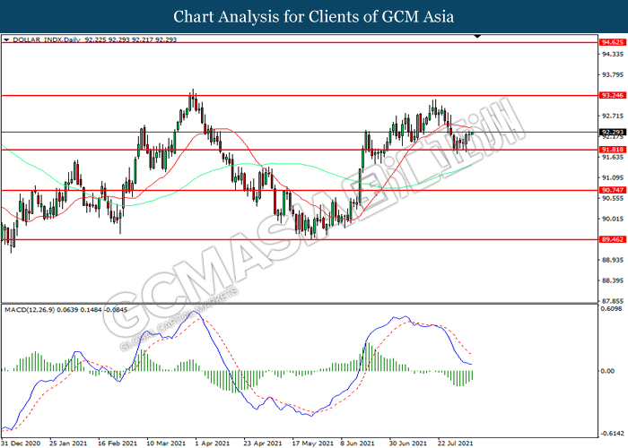 DOLLAR_INDX, Daily: Dollar index was traded higher following prior rebound from the support level at 91.80. MACD which illustrated diminishing bearish momentum suggest the index to extend its gains toward resistance level at 92.25.