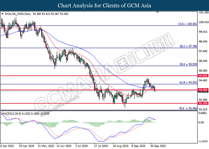 DOLLAR_INDX, Daily: Dollar index was traded lower following prior breakout below the previous support level at 93.50. MACD which illustrate diminishing bullish momentum signal suggest the dollar to extend its losses toward the support level at 92.10.