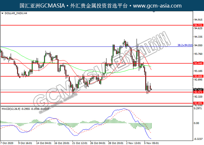 DOLLAR_INDX, H4: Dollar index was traded lower while currently testing the support level at 92.45. However, MACD which illustrated diminishing bearish momentum suggest the index to be traded higher in short-term as technical correction.