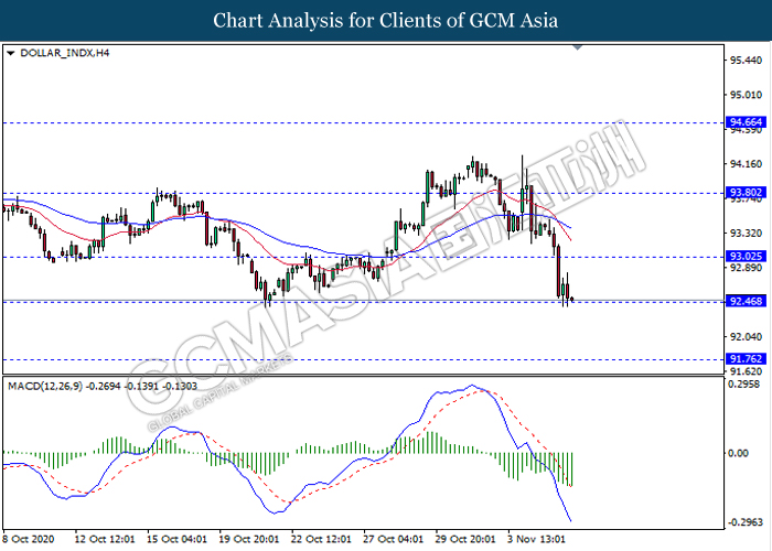 DOLLAR_INDX, H4: Dollar index was traded lower while currently testing the support level 92.45. MACD which illustrate persistent bearish momentum signal suggest the dollar to extend its losses towards the support level 92.45.