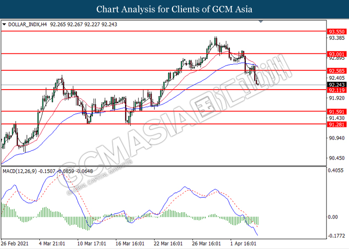 DOLLAR_INDX, H4: Dollar index was traded lower following prior breakout below the previous support level at 92.60. MACD which illustrated bearish bias momentum suggest the index to extend its losses toward the support level at 92.10.