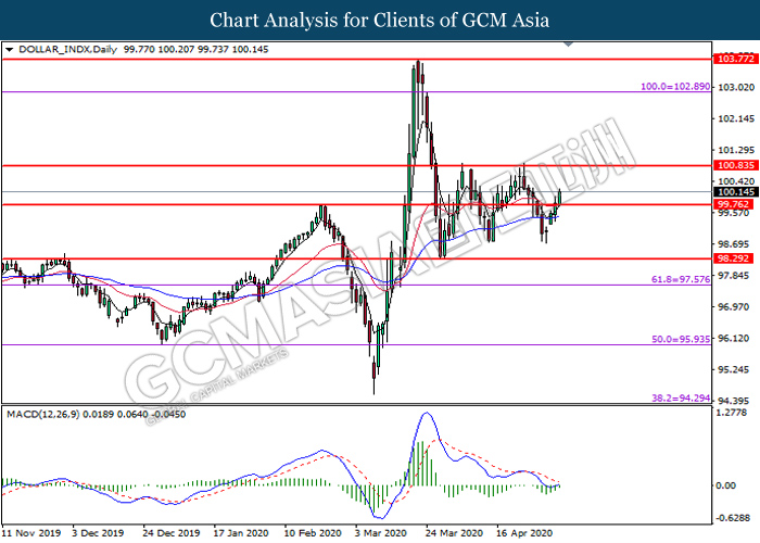 DOLLAR_INDX, Daily: Dollar index was traded higher following prior breakout above the previous resistance level at 99.75. MACD which illustrate diminishing bearish momentum suggest the pair to extend its gains toward the next resistance level at 100.85.