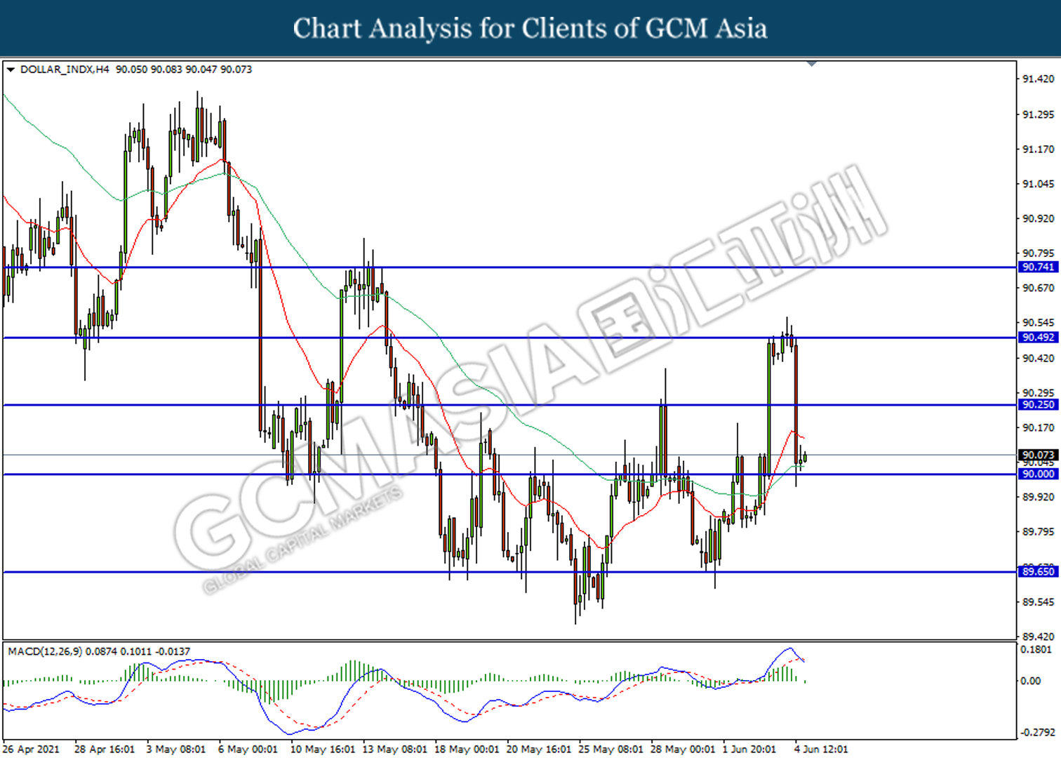 DOLLAR_INDX, H4: Dollar index was traded lower following prior retracement from the resistance level at 90.50. MACD which illustrated formation of bearish momentum suggest the index to extend its losses after breaking the support level at 90.00.