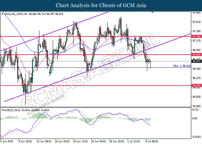 DOLLAR_INDX, H4: Dollar index was traded higher following prior rebound from the support level at 96.55. MACD which illustrate diminishing bearish momentum signal suggest the pair to extend its gains toward the resistance level at 96.85.