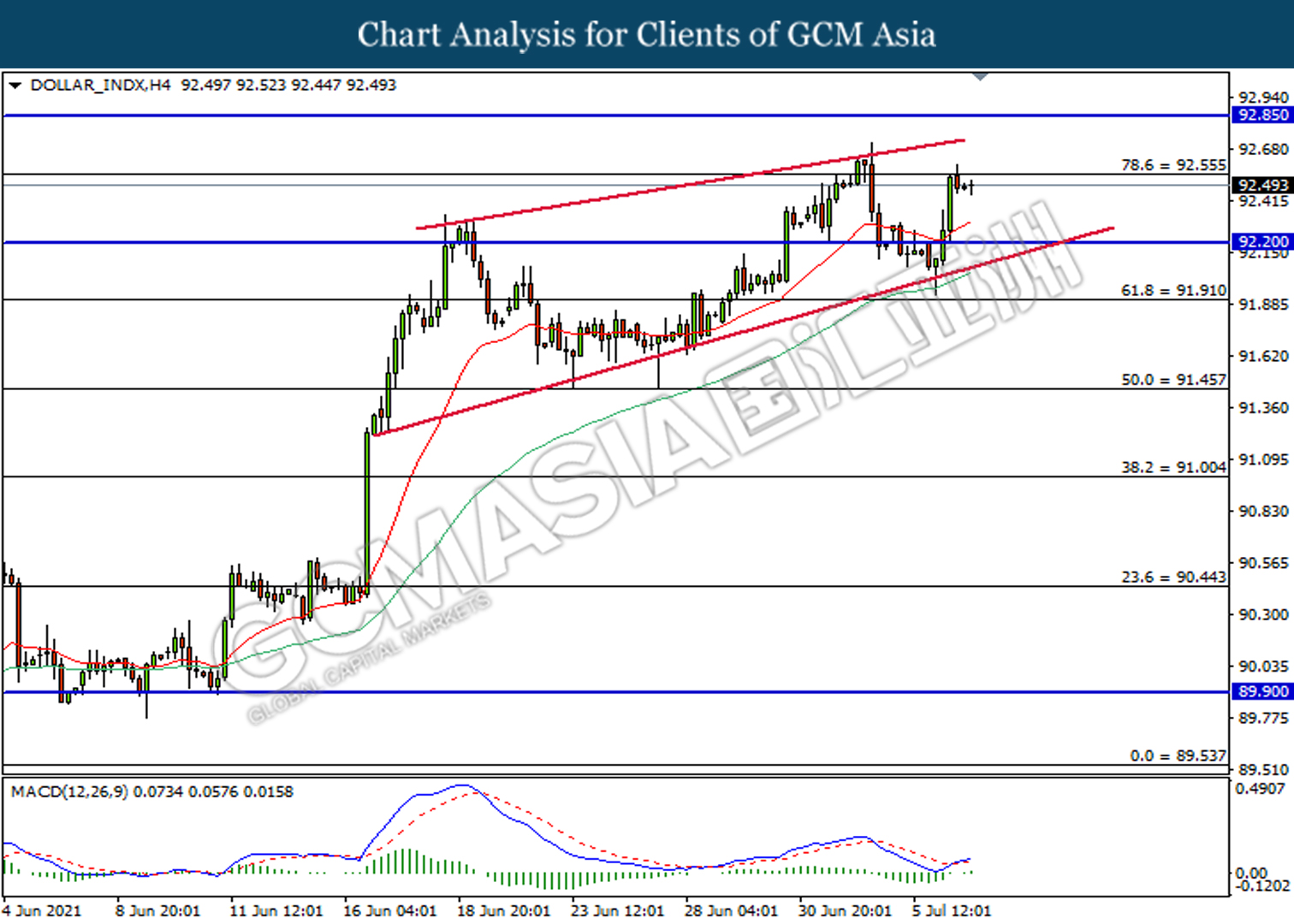DOLLAR_INDX, H4: Dollar index was traded higher following a rebound from the lower levels. MACD which illustrated bullish momentum suggest the index to extend its gains in short-term.